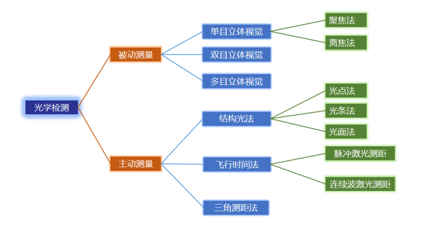 光學(xué)測(cè)量分為兩種測(cè)距法,一種是主動(dòng),一種是被動(dòng)。主動(dòng)測(cè)距方法是需要用特定的、人主動(dòng)去控制光源以及聲源,對(duì)被測(cè)物體進(jìn)行照射,我們依據(jù)物體的表面反射特性、光學(xué)和聲學(xué)特性來(lái)獲得被測(cè)物體的三維信息。主動(dòng)測(cè)距方法主要分為三種:(1)結(jié)構(gòu)光法(2)三角測(cè)距法(3)飛行時(shí)間法;被動(dòng)測(cè)距方法主要為雙目立體視覺(jué)測(cè)量。