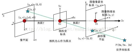 建立坐標(biāo)系后,相機(jī)成像過(guò)程抽象為坐標(biāo)轉(zhuǎn)換關(guān)系,如下圖2所示,三維到二維的成像過(guò)程可以用數(shù)學(xué)語(yǔ)言描述。