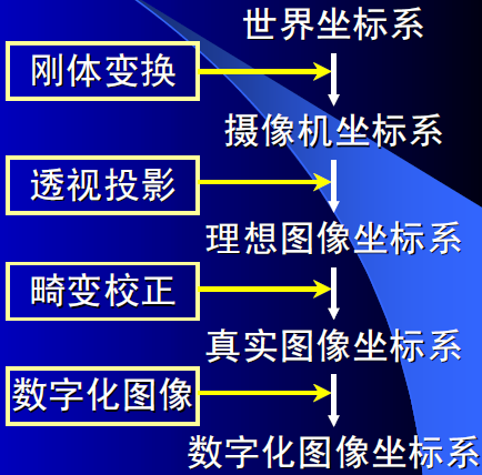 確定空間某點(diǎn)的三維幾何位置與其在圖像中對(duì)應(yīng)點(diǎn)之間的相互關(guān)系,相機(jī)成像過(guò)程建模,必須建立相機(jī)成像的幾何模型(各個(gè)坐標(biāo)系),這些坐標(biāo)系之間的轉(zhuǎn)換參數(shù)就是相機(jī)參數(shù)。首先引入四個(gè)坐標(biāo)系,坐標(biāo)系只是對(duì)相機(jī)建模的工具,并不是平白無(wú)故構(gòu)造的。