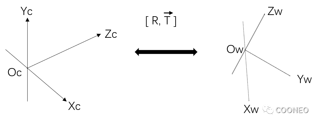 世界坐標(biāo)與相機坐標(biāo)都是三維坐標(biāo),遵循右手定則且三軸互相垂直。通常通過旋轉(zhuǎn)和平移的變化(外參矩陣)可以實現(xiàn)兩個坐標(biāo)系的轉(zhuǎn)換。
